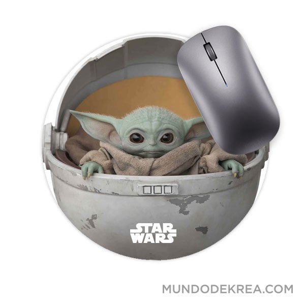 Alfombrilla para ratón de poliéster y silicona con impresión de baby Yoda en su cápsula.