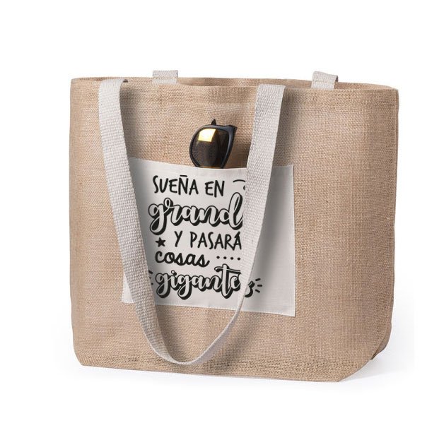 Bolsa de yute con bolsillo y asas de algodón.