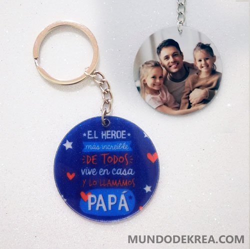 Llavero redondo de acrílico con anilla de acero inoxidable. Se entrega en un sobre decorado.