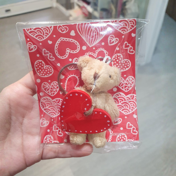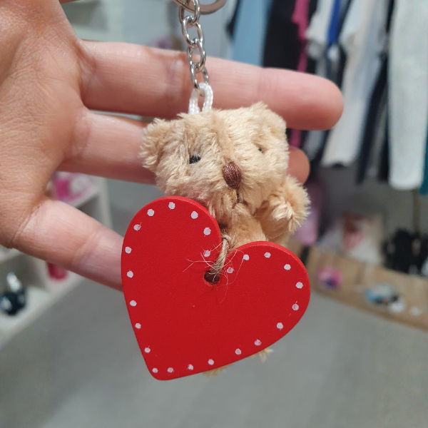 Llavero de osito de peluche tamaño miniatura con un corazón de madera que puedes personalizar con un nombre.