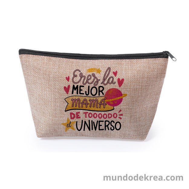 Estuche de poliéster color yute natural con cremallera, sublimado a todo color.