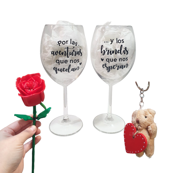 - 2 copas de cristal para vino tinto personalizadas con vinilo adhesivo en color negro. (Lavar a mano)