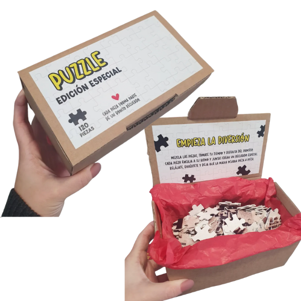 Para pasar un rato divertido tenemos esta cajita con un puzzle personalizado a tu gusto con imágenes, fotos, texto y dibujos que quieras.
