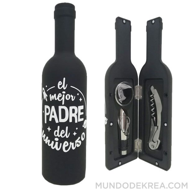 • Set de vino personalizado que incluye sacacorchos, boquilla y anillo anti goteo.