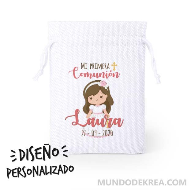 Pack de 25 saquitos de poliéster impreso con diseño personalizado de comunión.