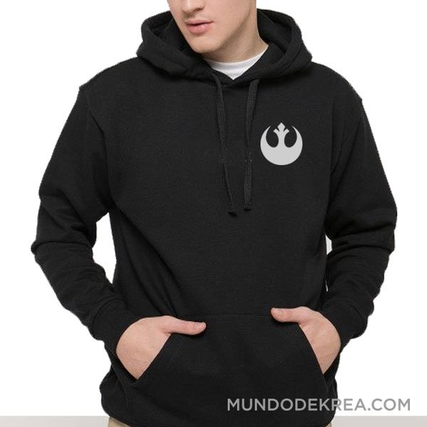 Sudadera con capucha y bolsillo con logo de star wars en espalda y escudo a elegir al frente.